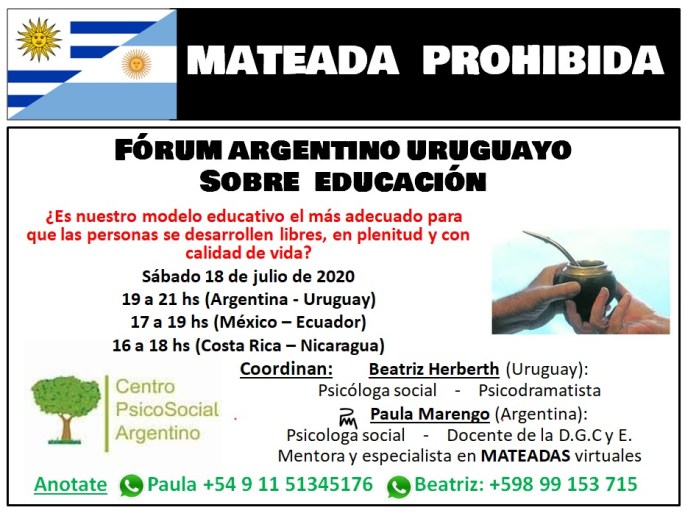 🇦🇷🇺🇾 Los convoca a pensar sobre lo que todos creemos saber acerca de la importancia de la educación. ❤Los invitamos a ver el documental educación prohibida por You Tube y compartir opiniones🎙️ 🍀El 18 julio por plataforma "Meet" ✍🏽✍🏽 inscripciones: mateadasvirtuales@gmail.com 🍀Argentina Uruguay 19:00 a 21:00 horas 🍀Mexico-Ecuador 17:00 a 19:00 horas 🍀Costa Rica y … Sigue leyendo Mateada Prohibido – ARGENTINA URUGUAYA