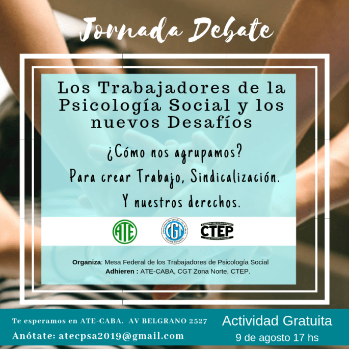 L@s Trabajador@s de la Psicología Social y los nuevos Desafíos 🍀 ¿Cómo nos agrupamos? - ❤ Para crear Trabajo, Sindicalización y nuestros derechos. Es una Actividad Gratuita. Te esperamos en ATE-CABA AV BELGRANO 2527 el día 9 de agosto a las 17 hs Para informes o inscripción tenes que escribir a este mail: atecpsa2019@gmail.com 🍀Organiza: Mesa Federal de los … Sigue leyendo Jornada Debate