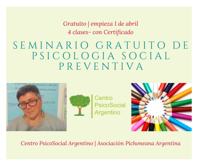A pedido de uds. seguidorxs de Apuntes Grupales este seminario tendrá una SEGUNDA EDICIÓN Queremos agradecer a Centro PsicoSocial Argentino, Escuelas Construyendo Alternativas y Asociación Pichoneana Argentina, por organizar esta segunda edición, recibimos muchos mails y muchos mensajes de personas que querían hacer este Seminario Virtual GRATUITO de Psicología Social Preventiva. Gracias muy especialmente al … Sigue leyendo Psicología Social Preventiva Seminario Virtual GRATUITO SEGUNDA Edición