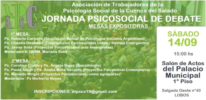 Este sábado 14 de septiembre a las 15 hs en el Salón de actos del Palacio Municipal (Salgado Oeste 40, primer piso) de la ciudad de Lobos tendrá lugar la Jornada Psicosocial Debate " La Psicología Social en el Interior de la Provincia y sus avatares" Inscribite en atpscs19@gmail.com Serán disertantes PS Claudia Deamelio PS … Sigue leyendo Jornada Psicosocial de DEBATE en la Ciudad de Lobos
