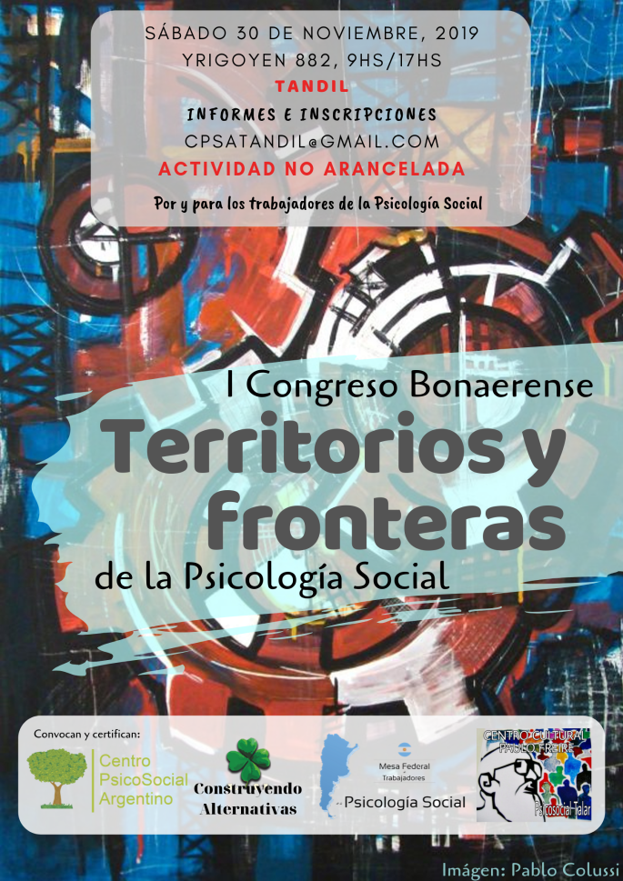 Queremos invitar a nuestr@s seguidor@s y lector@s a esta nueva propuesta Bonaerense I Congreso Bonaerense de los Trabajadores de la Psicología Social. 🍀 🍀 Se estará realizando el Sábado 30 de Noviembre, la acreditación a las 9 hs por lo que les pedimos puntualidad La dirección es 🍀 Hipólito Yrigoyen 882- Ciudad de Tandil. Es una actividad no … Sigue leyendo I Congreso Bonaerense de los Trabajadores de la Psicología Social