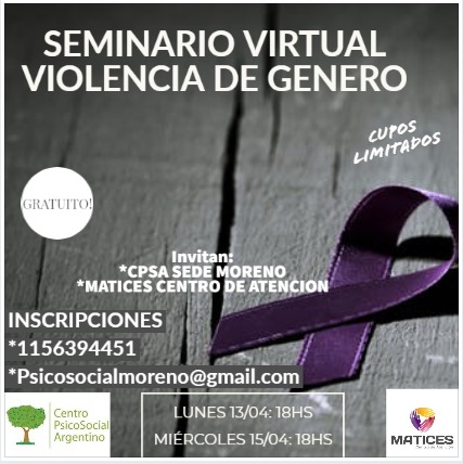 Actualización Gracias a las 400 personas que agotaron el cupo en menos de 10 horas!! wwoooowwww estamos muy content@s y sorprendidxs, las ganas de seguir creciendo de nuestrxs seguidorxs son inspiradoras!!!!!!! Gracias de parte del Centro PsicoSocial Argentino 🍀 Sede Moreno, 🍀Matices, Centro de Atención Integral y nuestro Equipo de redacción por el entusiasmo! Seguimos generando … Sigue leyendo SEMINARIO GRATUITO -VIRTUAL “Violencia De Genero ”